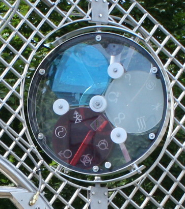 The “planetary disc” mechanism is based upon several functional types of planetary gear systems used in various machines today. This system uses a central “sun” gear and several “planetary” gears that rotate and revolve around it. They are used to change the torque and speed of the output shaft in relation to its input shaft. In the sculpture however, the motor shaft pushes the three tinted glass discs around the ring, resulting in a change of spatial relationships between the engineering and “life” symbols, which are sandblasted into the glass surface. The red, white, and blue discs refer to the American way of teaching engineering principles.