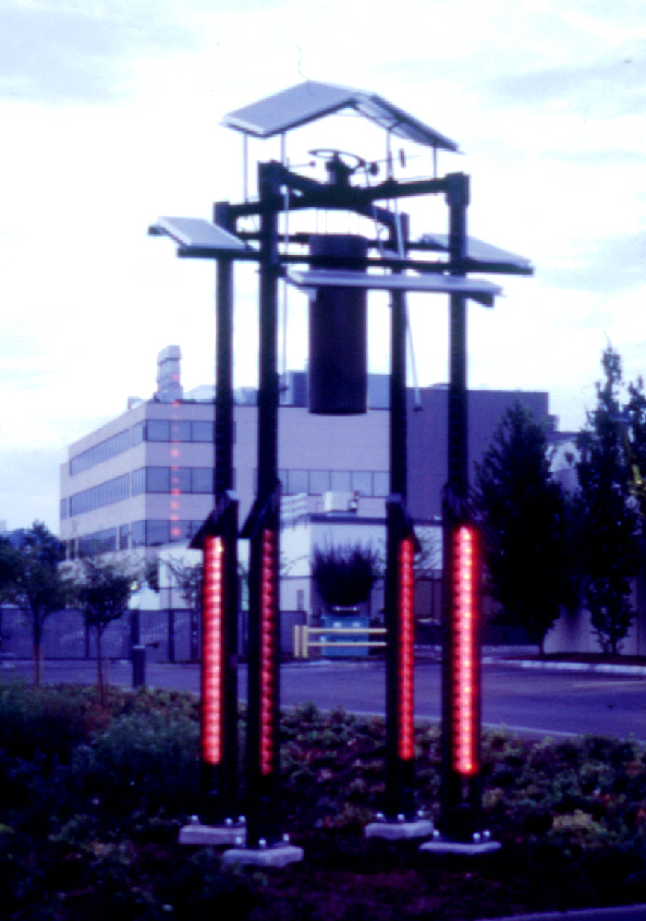 Luke Blackstone Copper aluminum, solar panels, sandblasted laboratory media bottles, light-emitting diodes, gearmotor, recycled bronze water tank, linkages, stainless steel hardware 18 ft. high 2004 |