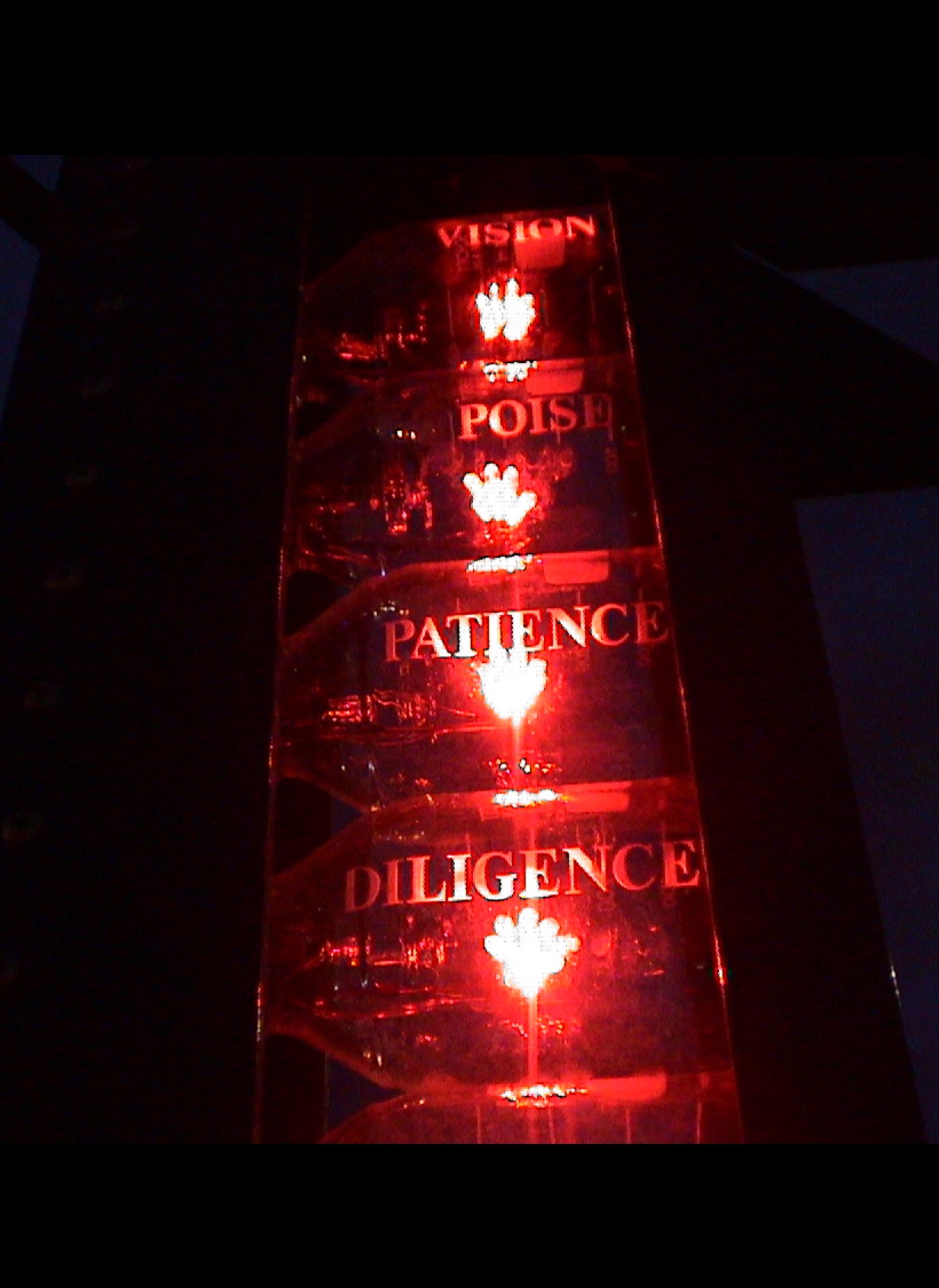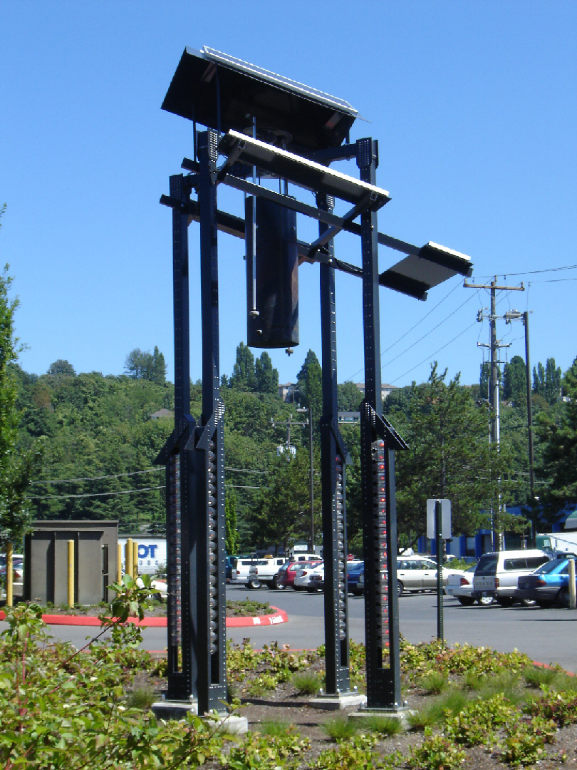 Copper is a permanent outdoor kinetic sculpture located at the Seattle Police Department support facility in Seattle, WA. During the daylight hours, five solar panels power a gearmotor, which cause three strikers to produce a gentle “heartbeat” sound. At night, 76 red light-emitting diode clusters turn on, illuminating words, which are sandblasted into the surface of the bottles. It was intended to provide a space where one can reflect on the values that sustain a worthwhile and valuable police force.