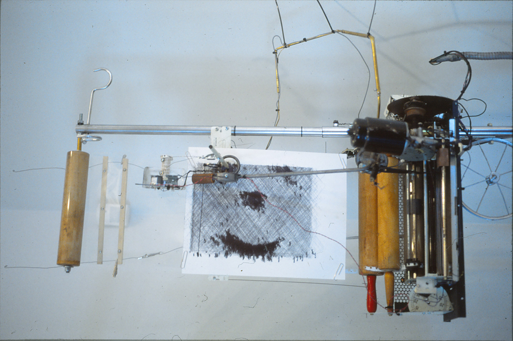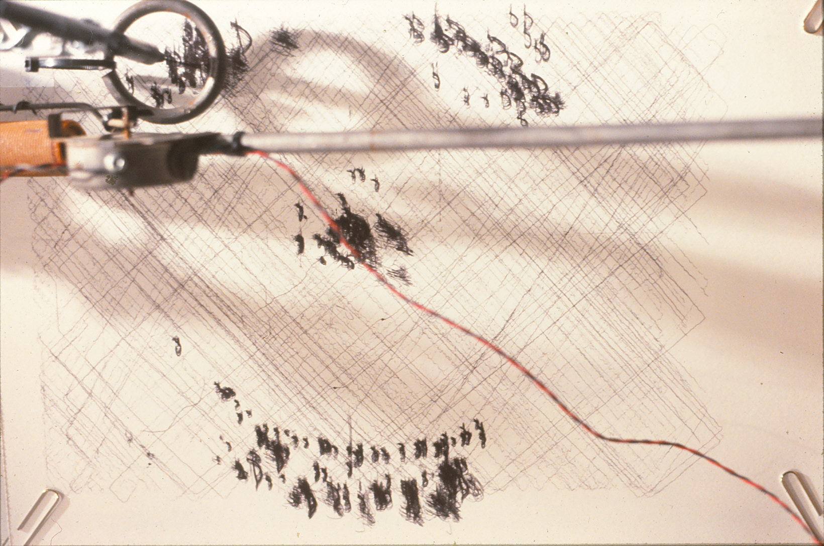 Donation Device was created to encourage visitors at the Charles H. Scott Gallery to donate money to the gallery. Every time a coin or bill (or slug) was dropped into the glass container, the mechanisms would energize for about 30 seconds. A rudimentary scanning cicuit would seek shadows of an object that was mounted behind the paper (an old spoked wheel in this case). When the shadow was detected, a pen struck the surface of the paper several times, creating a dot. Lines were created as the scanner searched for the shadow. Over time, many donators contributed to the overall drawing, and to the finances of the gallery.