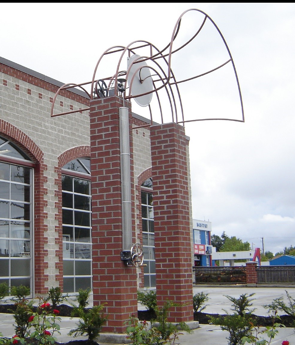 This project is interactive with the public via a simple hand crank that can be operated by the viewer. The crank wheel rotates a perforated disc and compressed air (supplied by the air compressor in the fire hall) to flow through the perforations, generating a soft and subtle siren sound audible only to those nearby. The flow of air through perforations is the basic operating principle of all mechanical sirens. In this way, the viewer is invited to generate the quintessential call to the Brotherhood, Sisterhood, and surrounding neighbourhood.