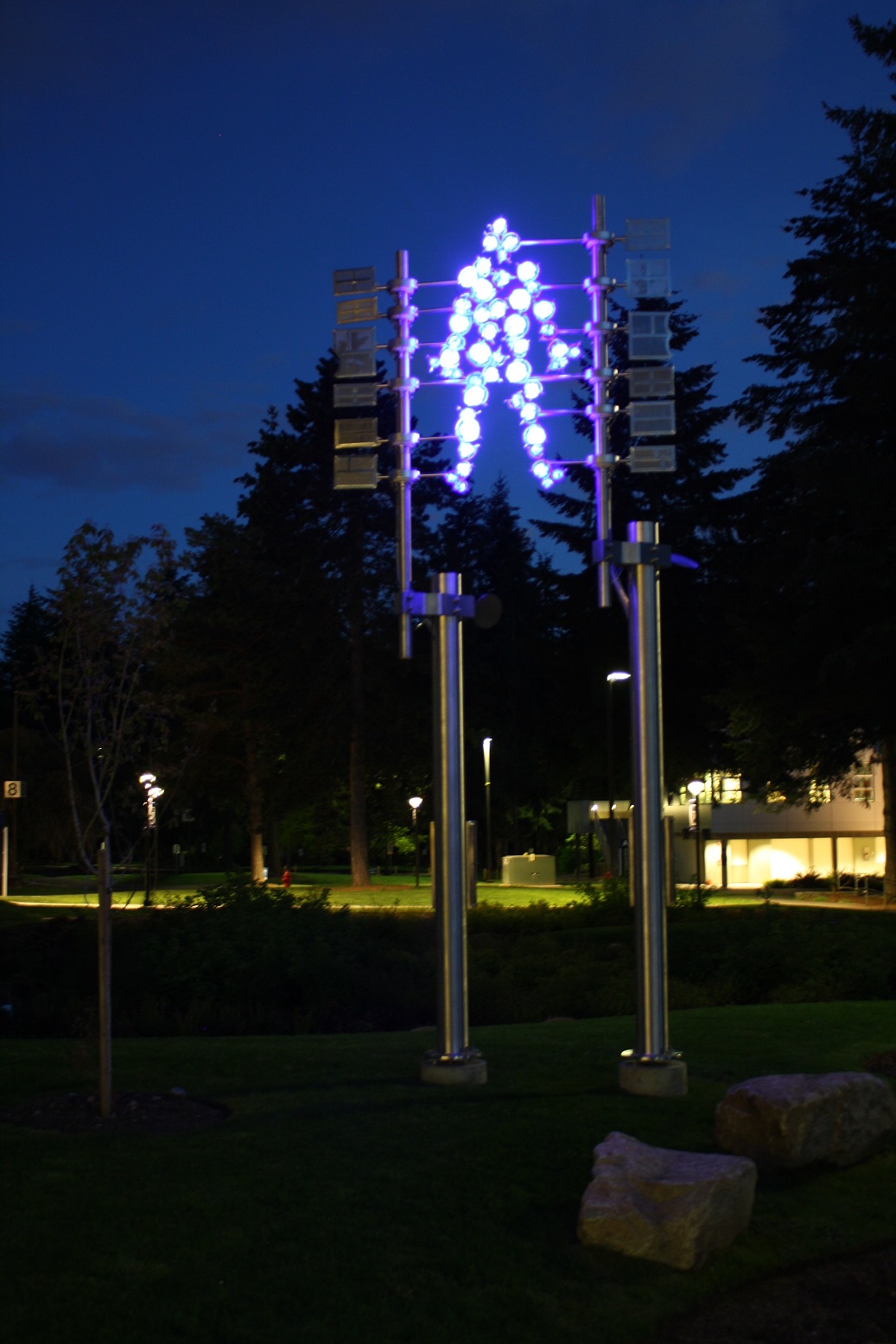 The spheres are made of hollow cobalt blue blown glass, with white LED string lighting inside. The clusters of spheres rotate randomly when wind pushes against the corresponding screens. Cables with weights are attached to the mechanisms so they have a tendency to return to the home position. After dusk, electrical switches detect when they are in this position and those spheres are illuminated from within, providing a small celebration of light.