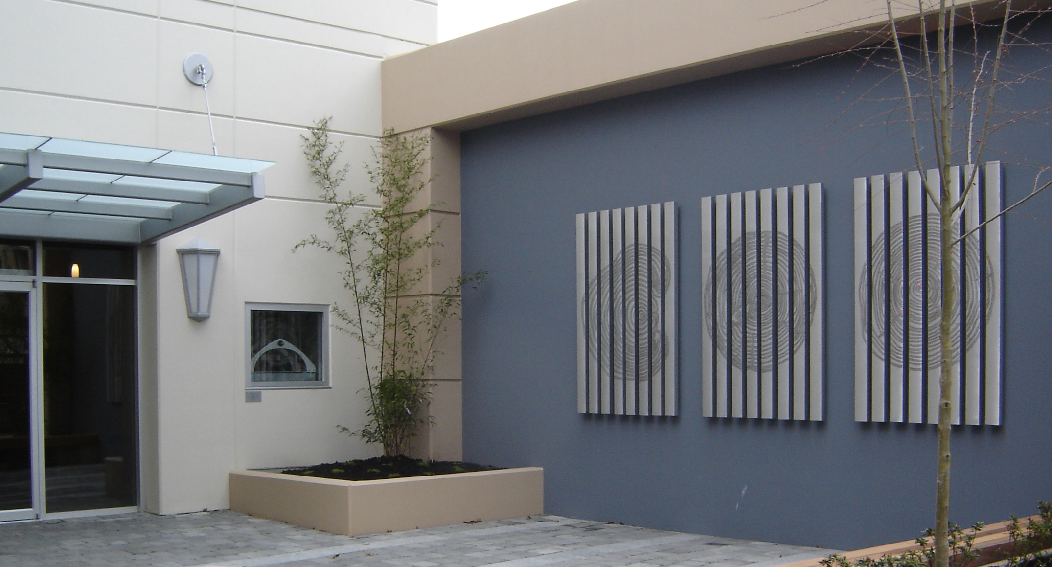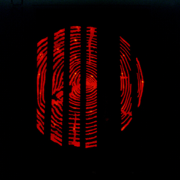Circulus Vitae is a Latin phrase meaning "cycle of lives" and was inspired by the name of the building, Silva, which means "a group of trees". The artwork connects the relationship between trees - as part of our environment and human breath - life. The mechanism in the lobby window refers to the human act of breathing. Every 4 seconds (a relaxed breathing rate), air is blown from two glass cylinders onto a leaf, which moves a tilt switch. This sends a signal to an electronic counter, which tallies the number of "breaths" taken over a period of a year. As the number increases, it is displayed in binary form via the red light-emitting diodes located behind the glass at the bottom of the window. Decimal numbers are etched into the glass to help convert the binary number system to the more familiar decimal number system. The window mechanism also controls light-emitting diodes that are mounted inside the exterior aluminum tubes. Each tube represents a binary digit. If a tube is illuminated, it is a "one". If it is not, then it is a "zero". By looking at which tubes are illuminated, it is possible to read the total number of breaths taken since the beginning of the year. Annual tree ring patterns, derived from native cedar, fir, and hemlock trees, are engraved into the tubes. At the end of the year, all 24 tubes will be illuminated and the wooden spoon will tap the glass cylindrical lungs, celebrating the beginning of a new year. back |
