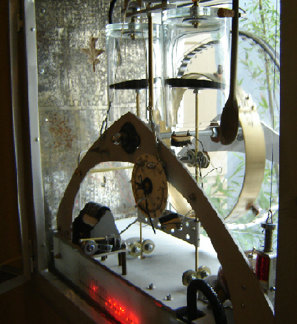 Luke Blackstone Circulus Vitae aluminum, light-emitting diodes, glass, electronic and electromechanical devices, wooden spoon, tea kettle, rubber, clear acrylic sheet, leaf exterior: 15 ft. X 6 ft. X 4 in. interior: 32 in. X 28 in. X 22 in. 2005 |