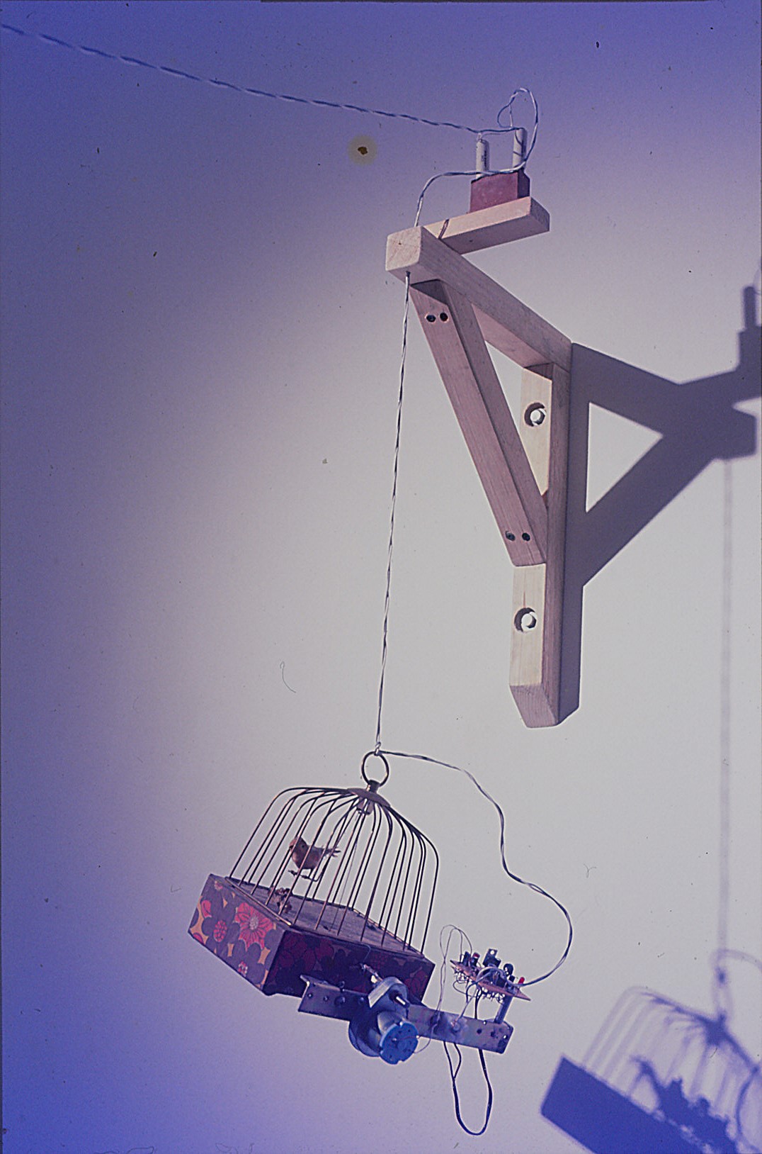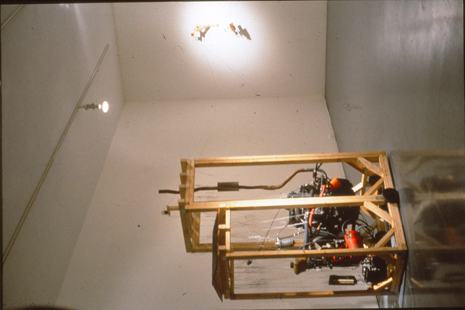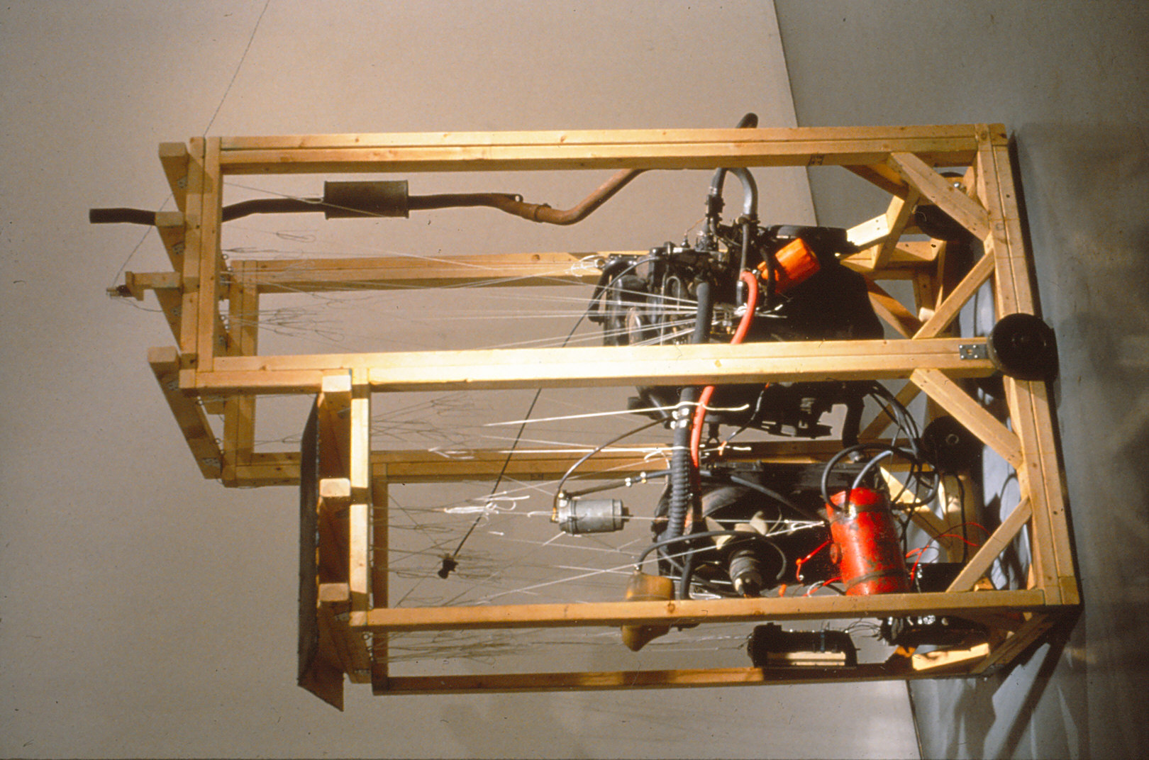 Luke Blackstone United We Hang wood, functioning VW diesel engine, nylon fibre, wire, hardware, electronic circiut, electric gearmotor, music box 2.5 ft. X 4.5 ft. X 7 ft. (plus peripherals) 1995 |