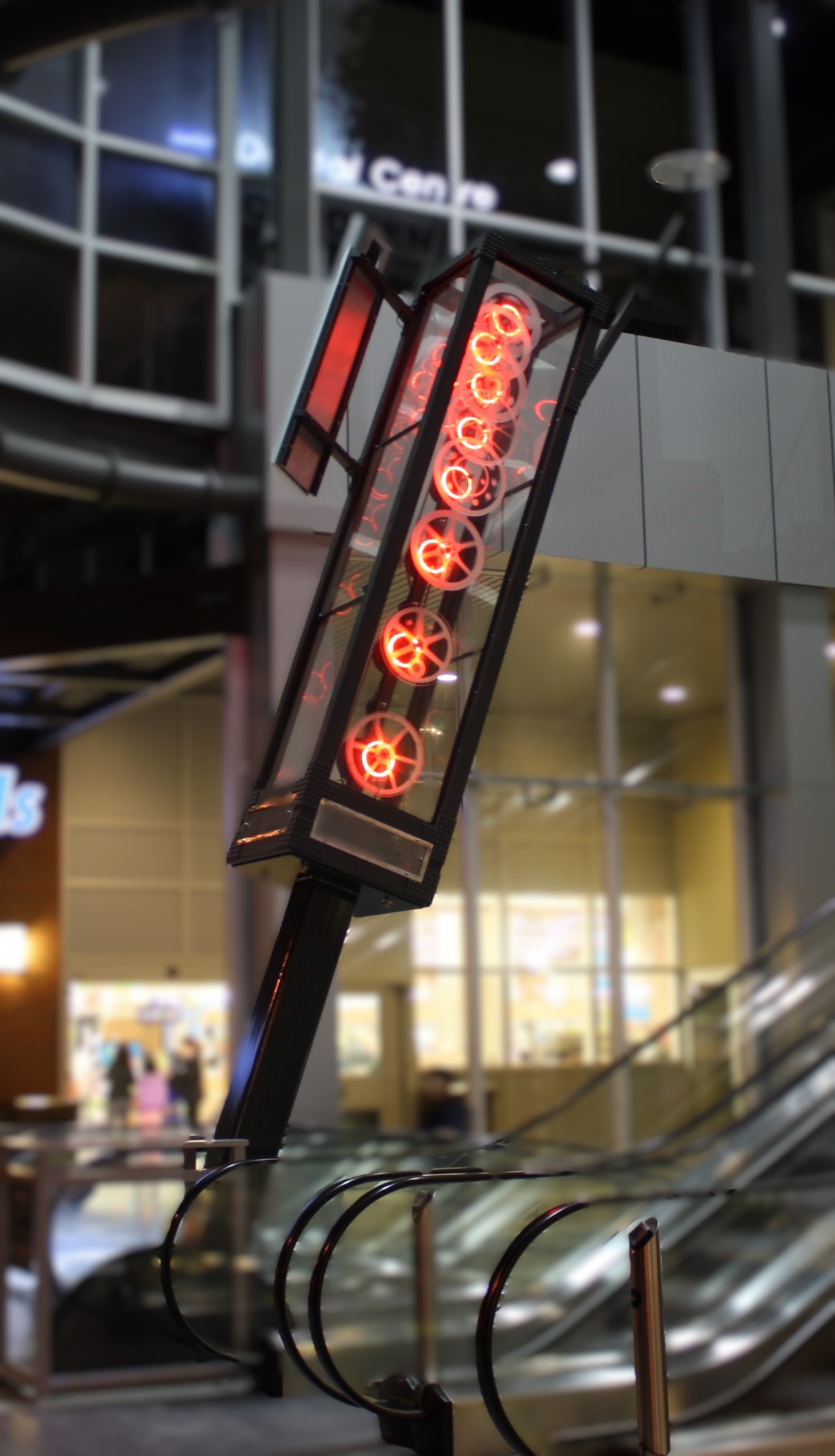 Transportation methods, (the theme requested by the project developer) in the Northgate area have changed significantly over the past century, but a common element has been, and still is, the wheel. Whether the vehicle of transport be a horse-drawn wagon, an automobile, a bicycle, skytrain, roller skates, a scooter, a penny-farthing, a unicycle, a skateboard, a tricycle, a wheelchair, or a bus, at least one wheel is employed. Thus, a visual history of transportation can be created using the imagery of the various types of wheels, and thereby linking the past, present and future of the Northgate community. To accomplish this, I photographed historical and present versions of wheels used for transportation in the Burnaby area. These images were simplified and transferred onto glass discs using the sandblast etching technique.