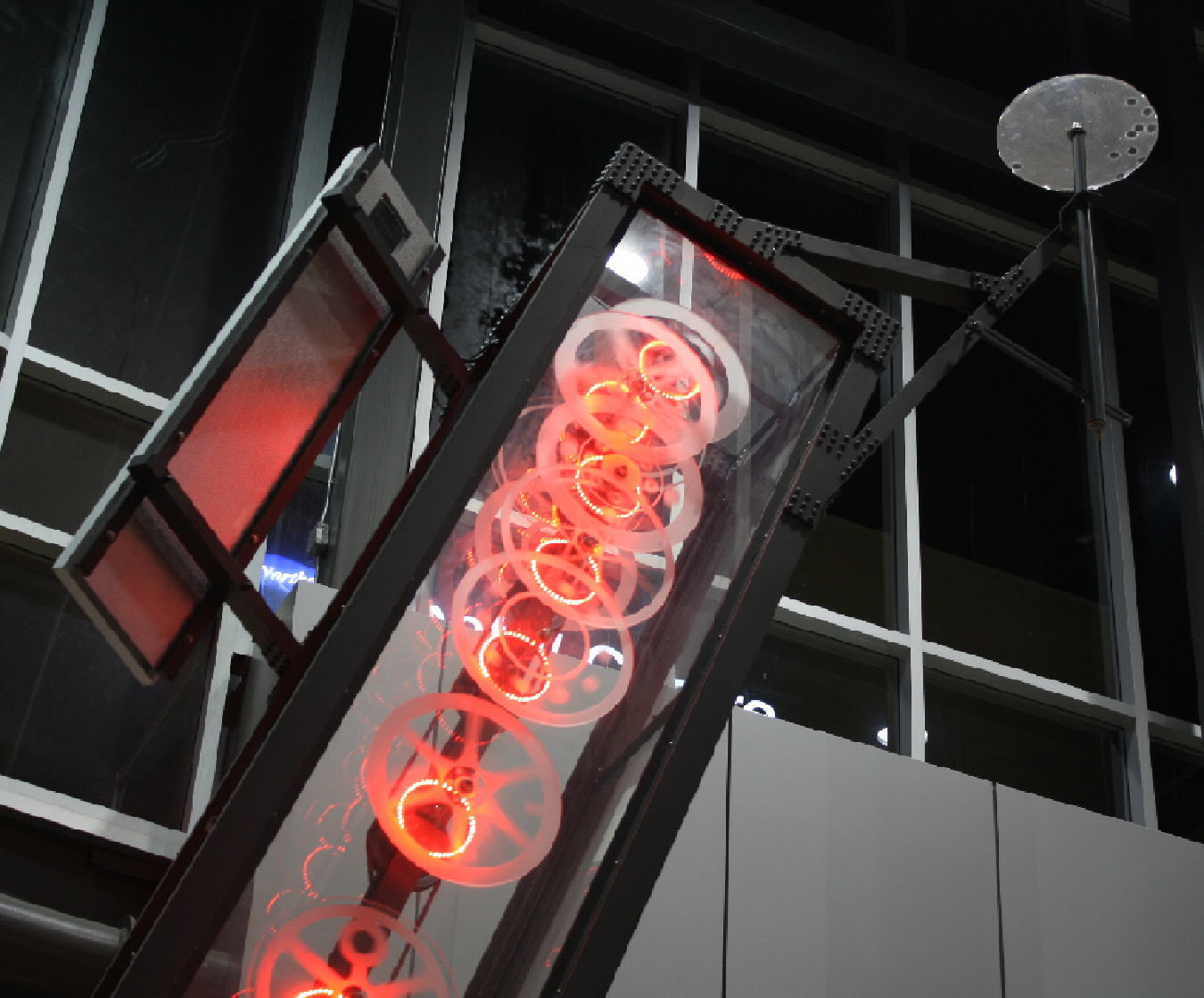 At the top of the structure, however, is one glass disc that does not rotate, and in contrast to all the other ones, it is mounted horizontally. This disc serves metaphorically as an invitational landing platform for those travelers in the future who employ a means of transportation that no longer requires the use of the wheel.